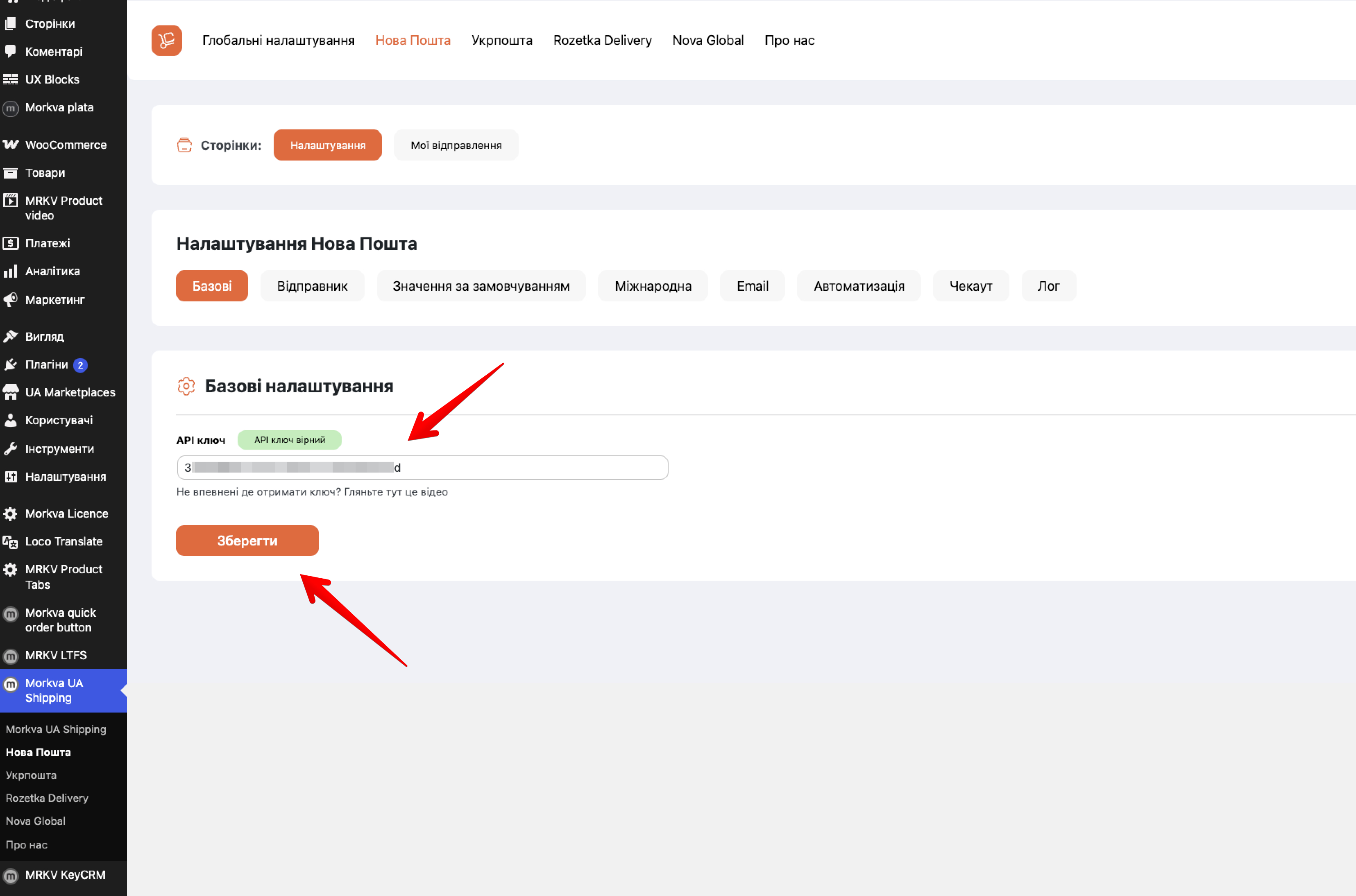 Вставте ключ на сторінку налаштувань Нової Пошти та натисніть "Зберегти".