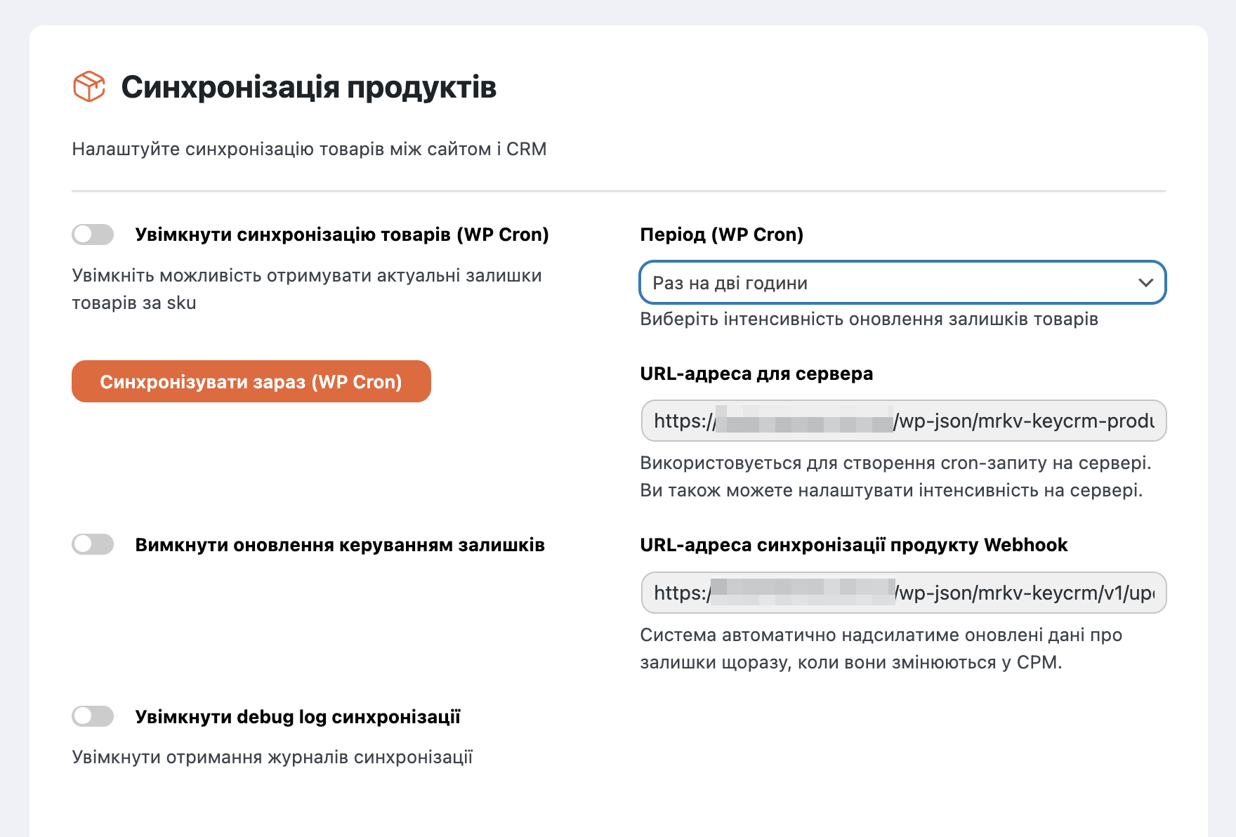 По замовчуванню синхронізація працює вбудованим функціоналом wp_cron. Якщо ви звикли працювати з серверним кроном, у плагіні це теж передбачено.