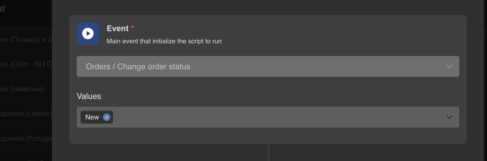 Заповніть всі обовʼязкові поля. З важливого,в поле Event обираємо Orders / Change order status. В полі Values обираємо ВСІ статуси які нам потрібні. Всі вони повинні бути співставлені в налаштуваннях плагіна.