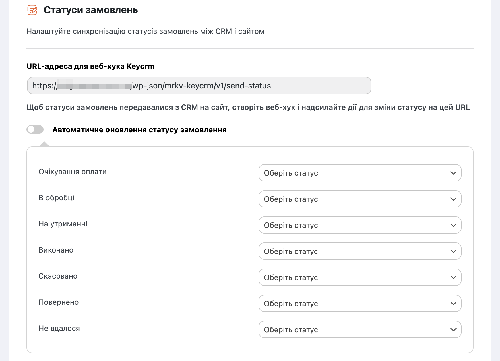 Якщо потрібно лише відправляти статуси з сайту в KeyCRM, достатньо ввімкнути чекбокс "Автоматичне оновлення статусу замовлення"