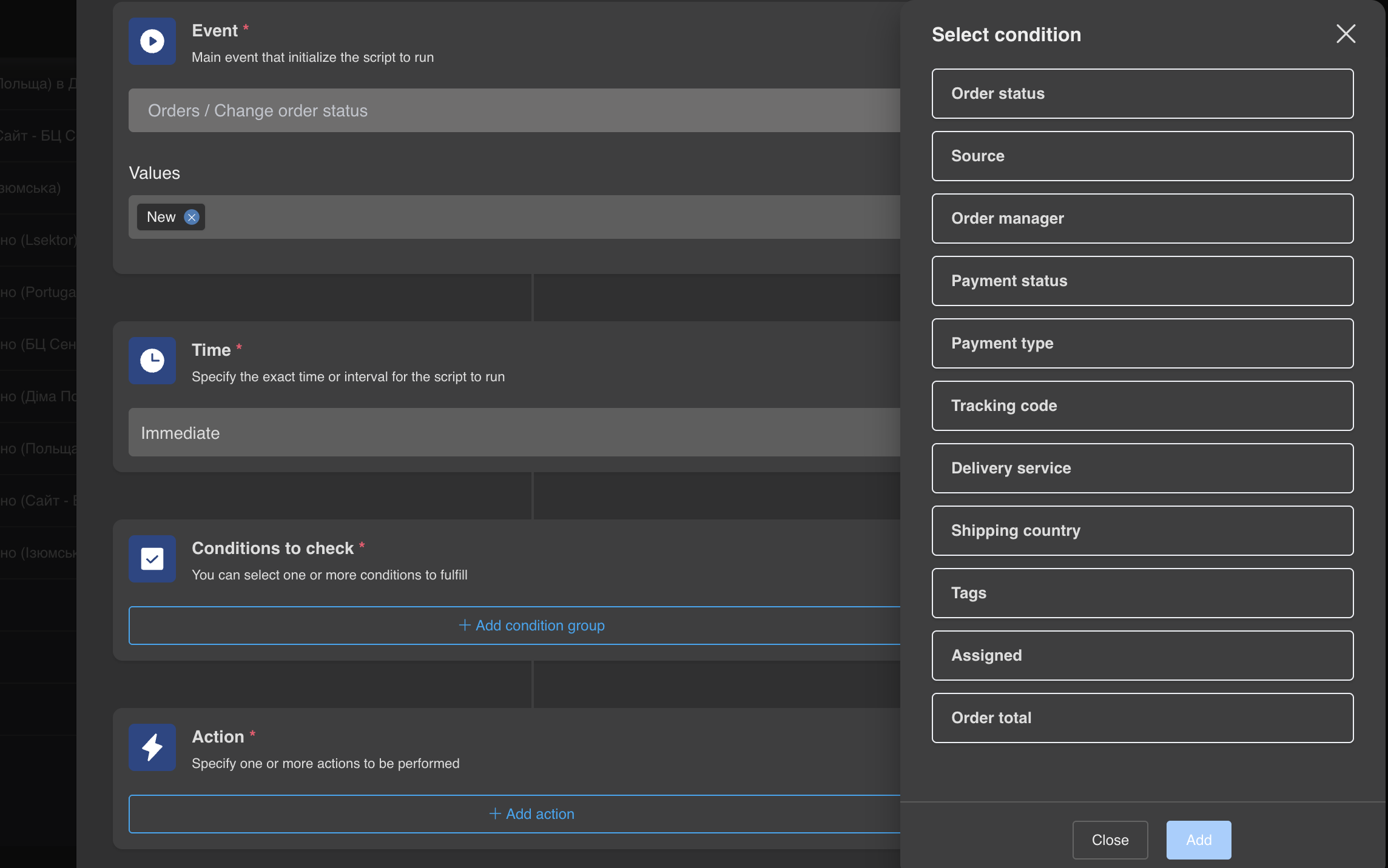 В полі Conditions to check можна відфільтрувати більш скурпульозно, наприклад обрати лише замовлення по певному способу доставки, джерелу і.т.д.