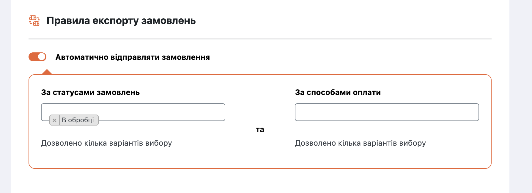 На скріншоті показано правило, автоматично відвантажувати всі замовлення у статусі "В обробці". Якщо надійде замовлення в іншому статусі, воно не вивантажиться автоматично. Можна додати декілька статусів чи декілька способів оплат.
